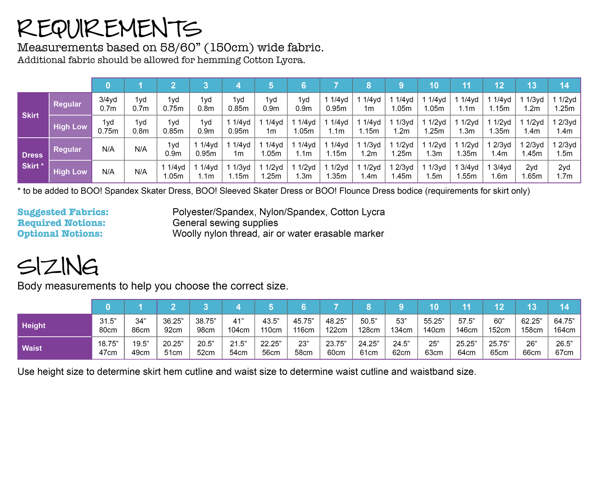 Included are 2 stand-alone skirts (regular & high low) as well 2 dress add-ons (regular & high low). The dress skirts can be added to the bodices of the Spandex Skater, Sleeved Skater, Flounce or Illusion Dress.