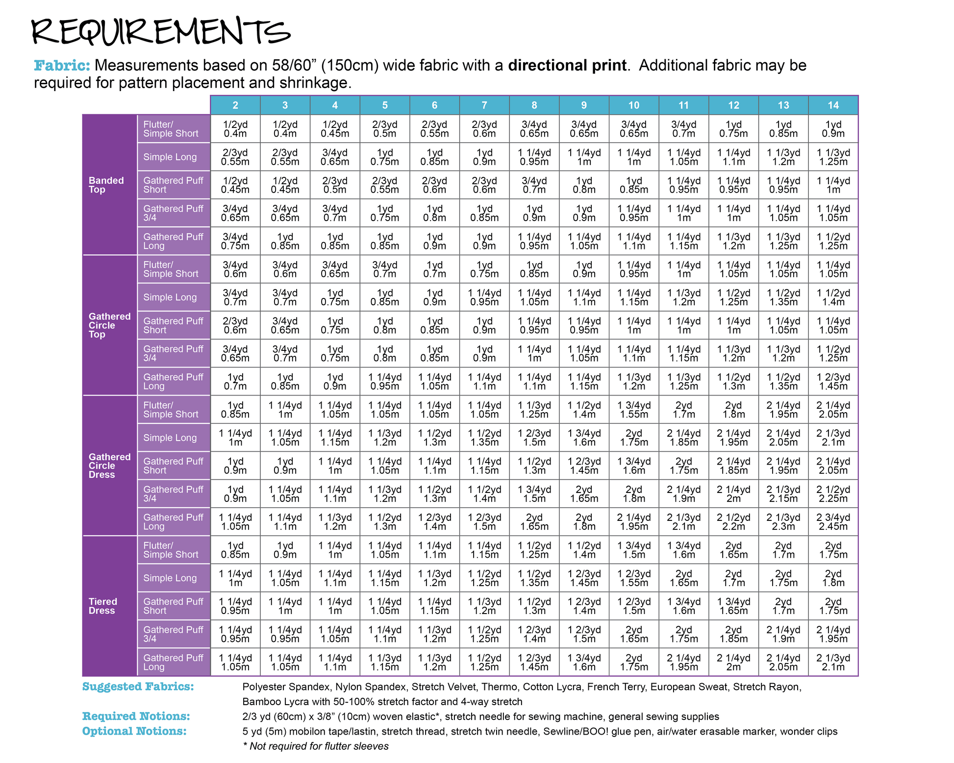 - 2 top options; gathered circle skirt or banded waist