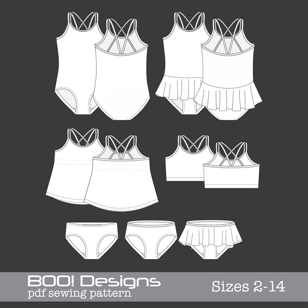 The Twin Swim pattern is the perfect way to showcase your binding skills. It includes a bikini, crop, tankini, tankini with shelf bra, briefs with optional skirt and one-piece with optional skirt.